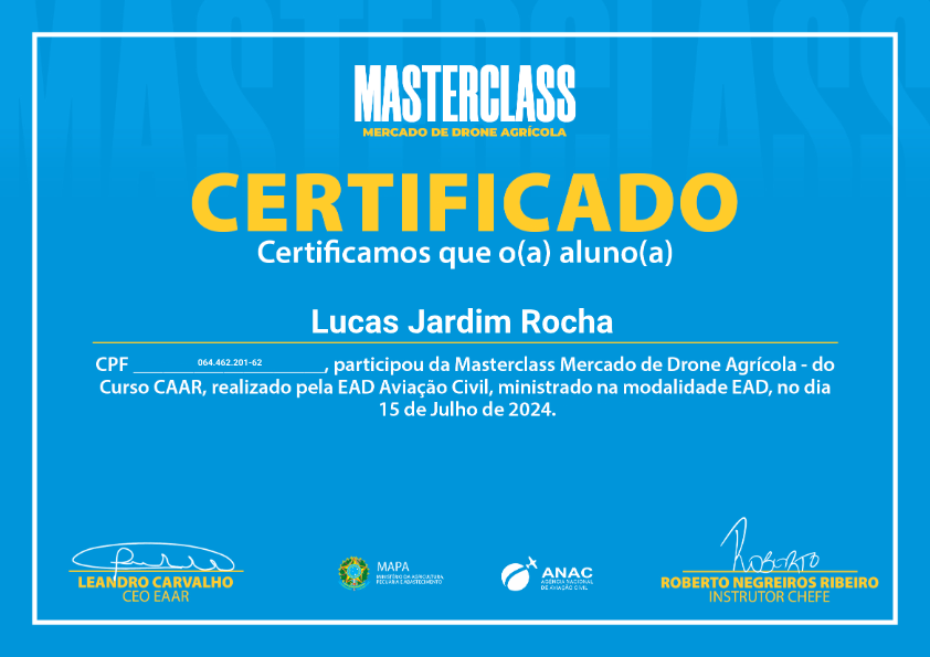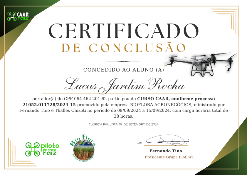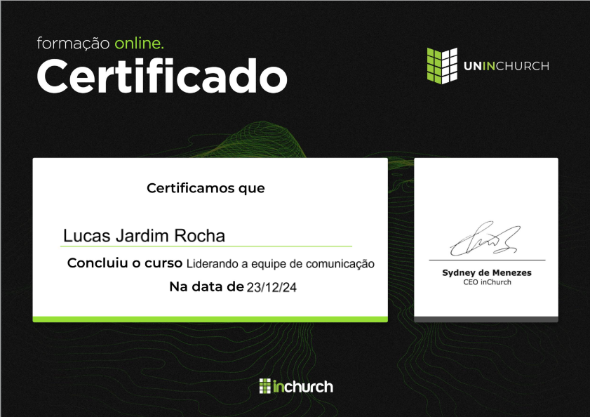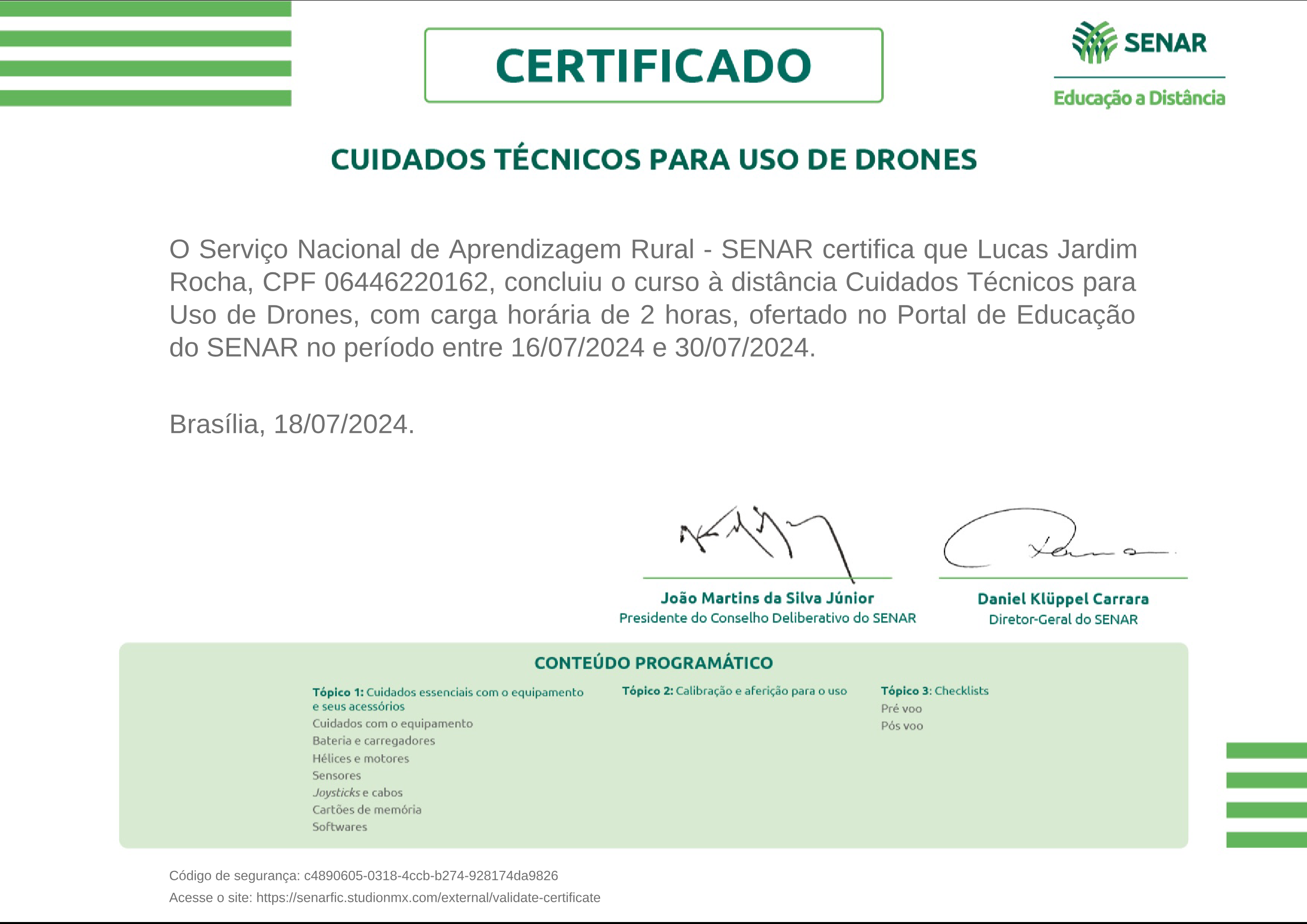 Formação acadêmica, cursos e certificados organizados por tecnologia, criatividade, liderança e operação no campo.